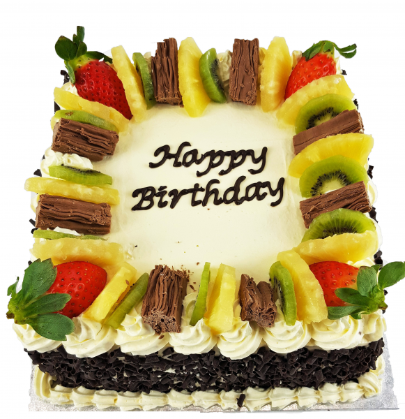 A Vibrant Eggless cake with a Variety of fruits topping giving the cake a summer twist, this cake will surely create a party in your mouth. The Victoria Style sponge cake includes three layers of 100% pure fresh cream layered with creamy heavenly swirls. Be sure to have your guests go Wild at your special event such as Engagement, Birthdays or Wedding. All our cakes can have a personalised message written even while you wait, free of charge.Fresh cream.***Coloured cream may stain. It will taste bitter and has been known to cause hyperactivity in children!***Colour & design may vary.Subject to availability. Please contact your collecting branch before placing your order..Serving numbers are an approximate guideline. Actual portion numbers will vary according to how the cake is sliced.May contain nuts, gluten, soya and milk