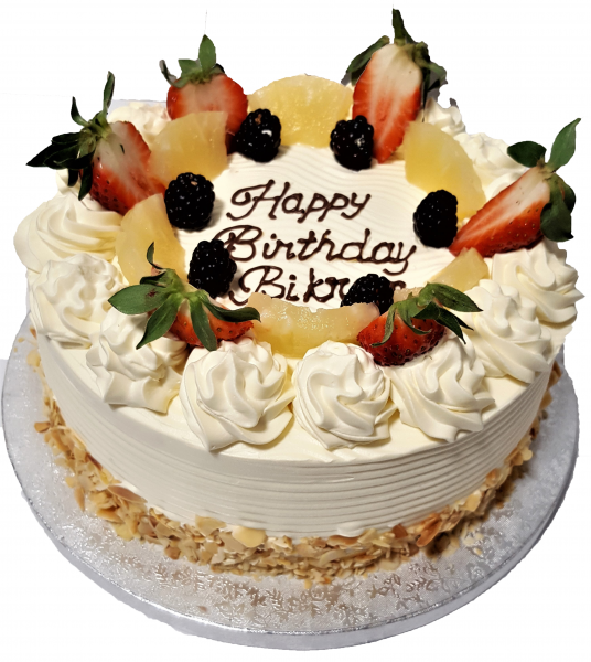 A Vibrant Eggless cake with a Variety of fruits topping giving the cake a summer twist, this cake will surely create a party in your mouth. The Victoria Style sponge cake includes three layers of 100% pure fresh cream layered with creamy heavenly swirls. Be sure to have your guests go Wild at your special event such as Engagement, Birthdays or Wedding. All our cakes can have a personalised message written even while you wait, free of charge.Fresh cream.***Coloured cream may stain. It will taste bitter and has been known to cause hyperactivity in children!***Colour & design may vary.Subject to availability. Please contact your collecting branch before placing your order..Serving numbers are an approximate guideline. Actual portion numbers will vary according to how the cake is sliced.May contain nuts, gluten, soya and milk