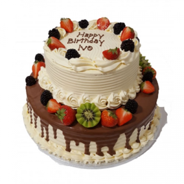A Vibrant Eggless cake with a Variety of fruits topping giving the cake a summer twist, this cake will surely create a party in your mouth. The Victoria Style sponge cake includes three layers of 100% pure fresh cream layered with creamy heavenly swirls. Be sure to have your guests go Wild at your special event such as Engagement, Birthdays or Wedding. All our cakes can have a personalised message written even while you wait, free of charge.Fresh cream.***Coloured cream may stain. It will taste bitter and has been known to cause hyperactivity in children!***Colour & design may vary.Subject to availability. Please contact your collecting branch before placing your order..Serving numbers are an approximate guideline. Actual portion numbers will vary according to how the cake is sliced.May contain nuts, gluten, soya and milk